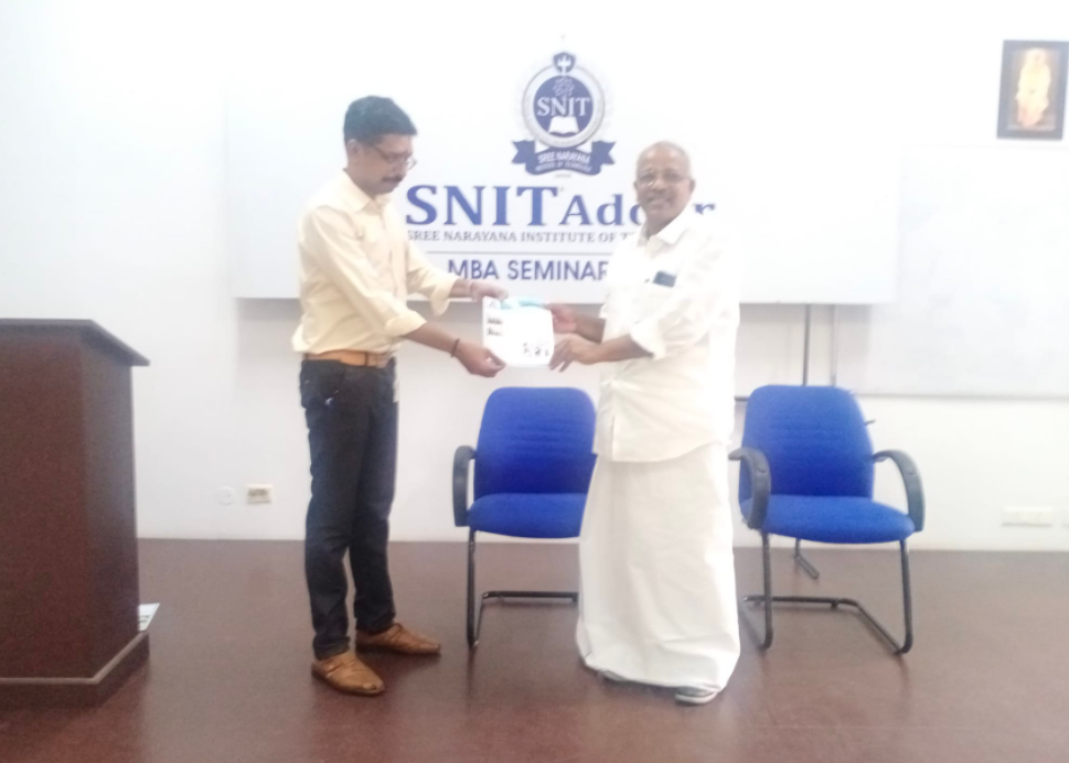 26/11/2021 Venue: MBA Seminar Hall Today MBA Department celebrated a day for Honouring Mr Vishnu Vijayan (Advisor of 2019-21 MBA Batch) for his great achievement of 100% Result and Placement as an Advisor of the Batch of SNIT Adoor.