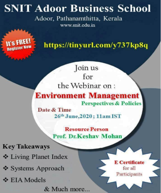 Dear Sir/Ma’am, Greetings from SNIT Adoor Business School……!!! We are happy to present an International Interactive Webinar on “Environment Management: Perspectives & Policies” on 26th June 2020, 11 am IST. The Webinar is open and relevant to students in higher education in all disciplines and working professionals from diverse sectors as Environment Management is Neutral....