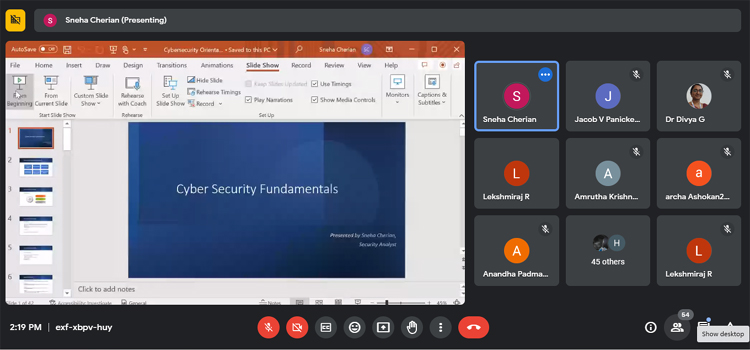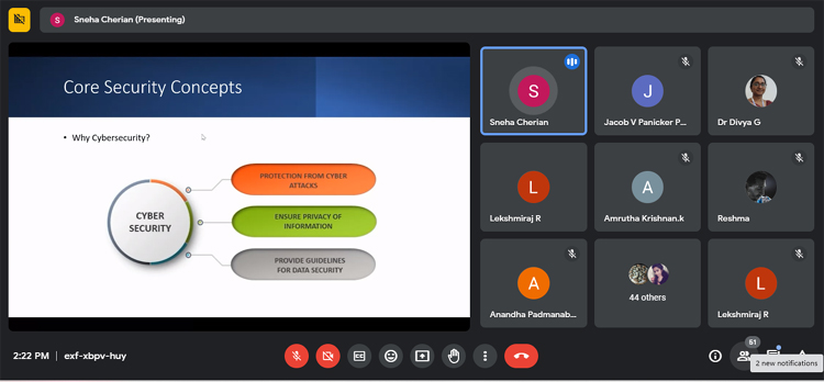 Ms. Sneha Mariam Cherian, a seasoned Cyber security Analyst, brought extensive industry expertise to elucidate intricate concepts and real-world scenarios. Participants were exposed to fundamental cyber security principles,