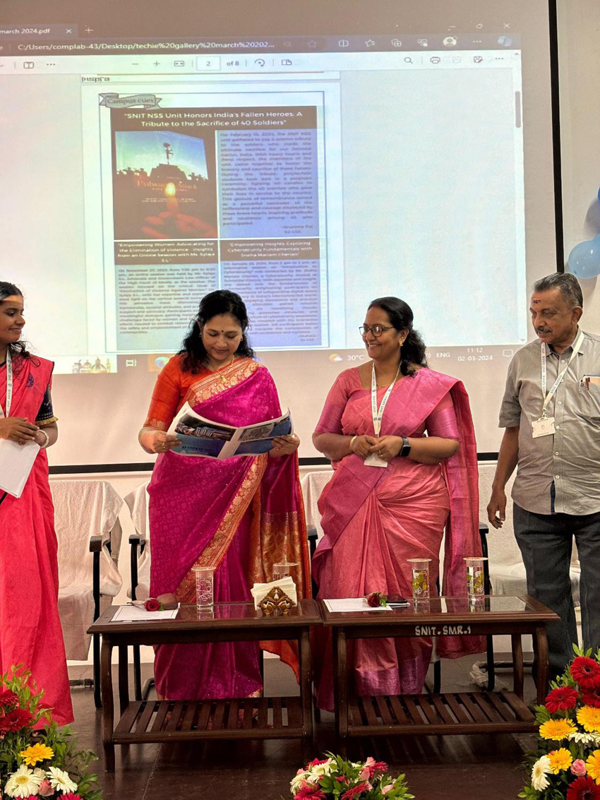 The Newsletter releasing ceremony of Computer Science Department ‘Techie Gallery’ was conducted along with Department Association (INSPRA) Inauguration on 2nd March 2024 at CSE Seminar Hall. The presence of our esteemed Chief Guest Dr. Reshmy Krishnan (Head of Research & Associate Professor (Computing), Muscat College, Sultanate of Oman) at the event added an aura of distinction and importance, further elevating the significance of the newsletter release and underscoring the value of the insights and perspectives shared during the proceedings. The event commenced with a warm welcome to all attendees, including faculty members, students and distinguished guests by Adithyan B, President of INSPRA. After the welcome speech, HOD of Computer Science Department Dr. Jaya Shankar emphasized the significance of Techie Gallery, its objectives and the process of creating and curating content. In the event, Ms. Sneha Anna John, Assistant Professor of Computer Science Department handed over the newsletter to Prof. N. Radhakrishnan Nair, Academic Coordinator for official releasing in the presence of Principal Dr. Shaji Mohan B., our chief guest Dr. Reshmy Krishnan, HODs of other departments, faculty members and S2 students of Computer Science Department. The highlight of the event was the attendees had the opportunity to be among the first to access and explore the content of the newsletter, which was made available in both digital and printed formats. Higher authorities and heads of departments made insightful comments during the felicitation, offering valuable suggestions on how to enhance the newsletter by incorporating new material and improving existingcontent.
